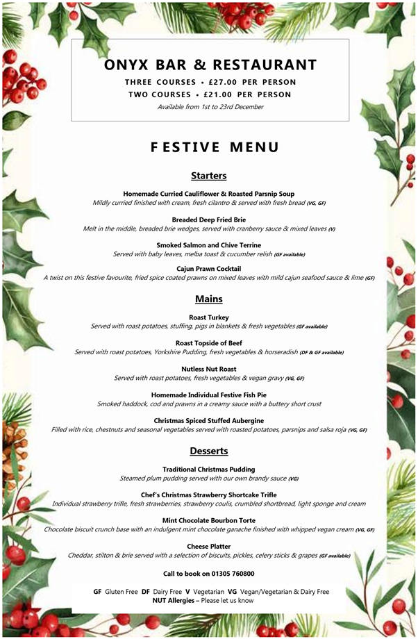Join us at Onyx for a memorable Christmas meal. You'll find our Christmas menu below, which is available from the 1st of December onwards. For enquiries and reservations, please contact us on 01305 760800.